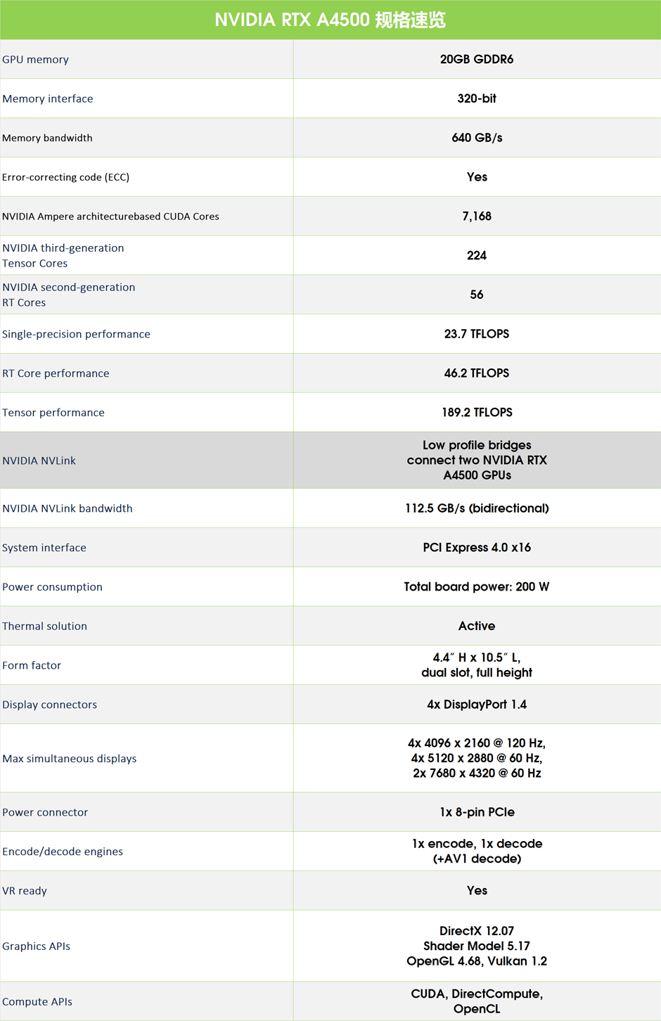 NVIDIA RTX A4500是一种双插槽卡,从1个8针电源连接器中吸取电源,最大额定功率为200 W。显示输出包括:4x DisplayPort 1.4a。RTX A4500使用PCI Express 4.0 x16接口连接到系统的其余部分。该卡长267毫米,宽112毫米,具有双槽冷却解决方案。