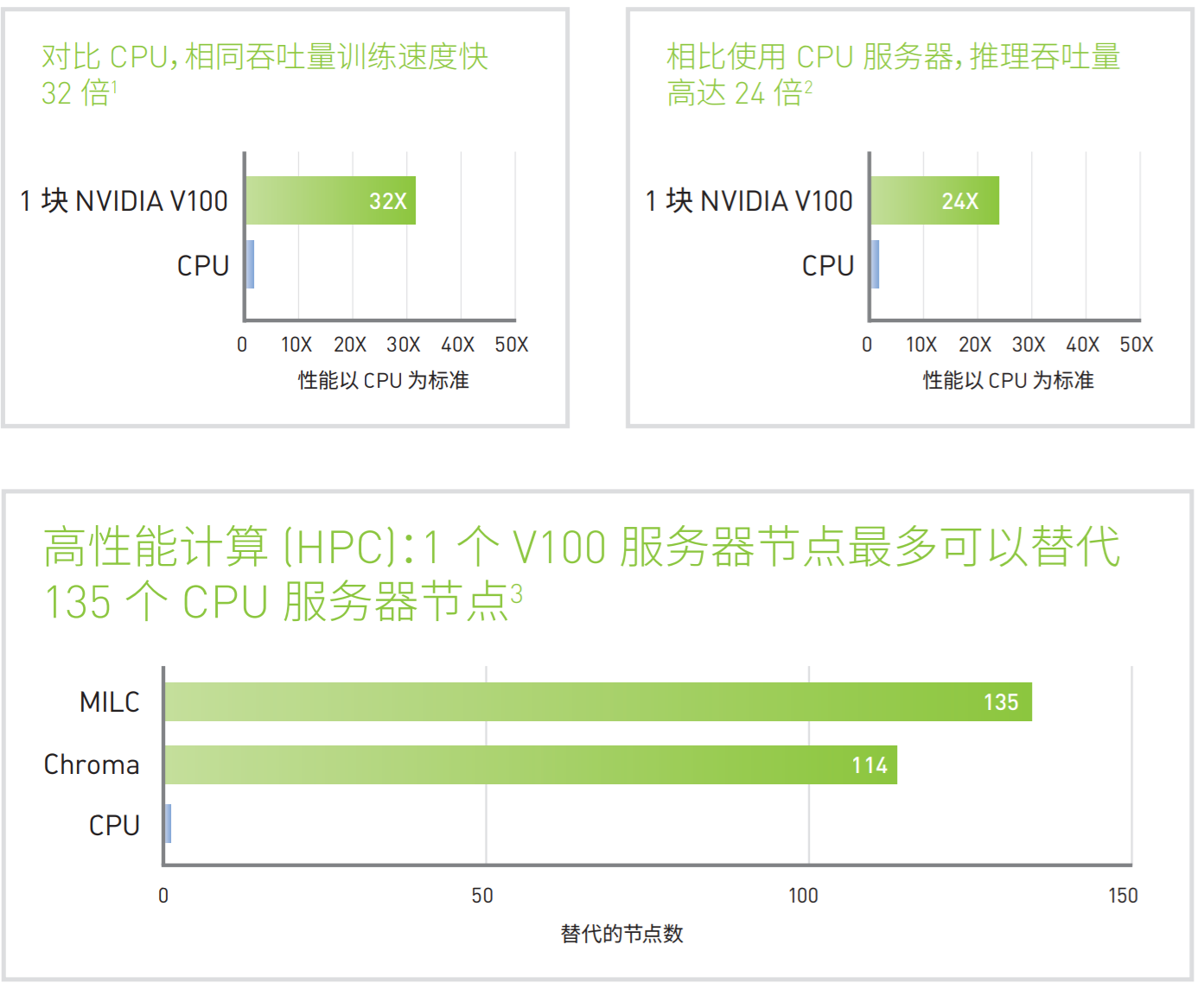 V100 是 NVIDIA 数据中心平台在深度学习、HPC 和图形领域的强大产品。该平台可为 600 余款 HPC 应用和 各大深度学习框架提供加速。此平台适用于桌面、服务器以及云服务,不仅能显著提升性能,还能节省成本。