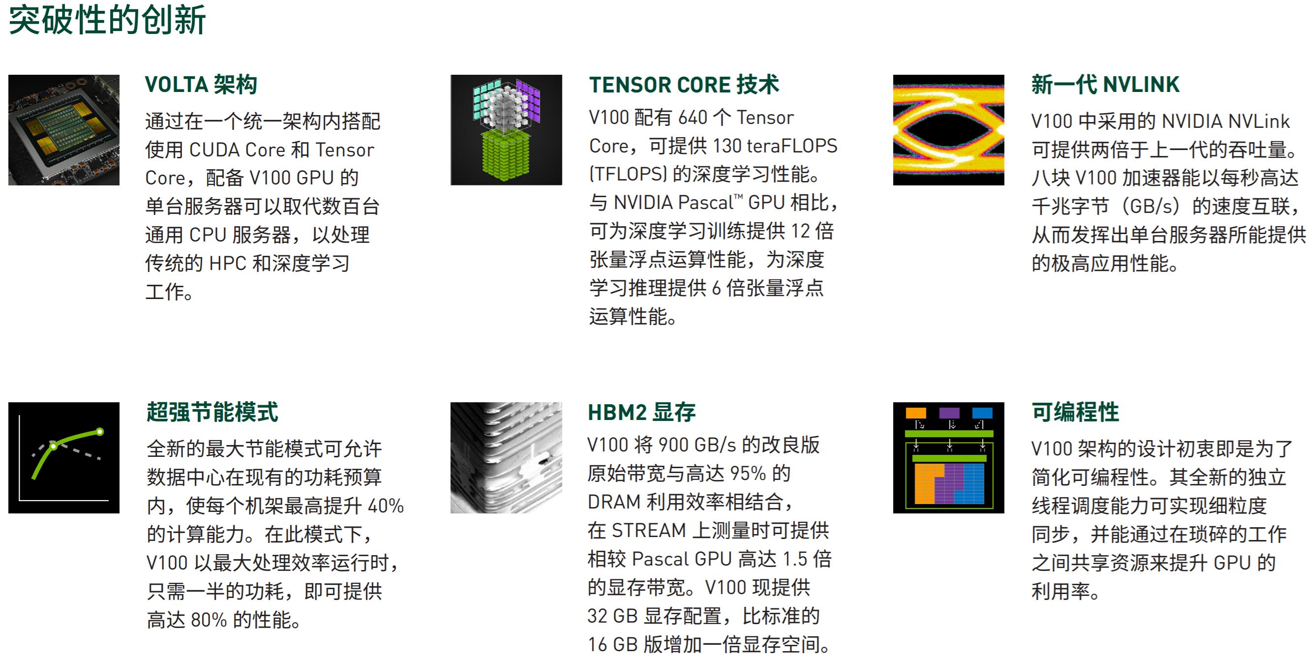 NVIDIA® V100 Tensor Core GPU 是深度学习、机器学习、 高性能计算 (HPC) 和图形计算的强力加速器。V100 Tensor Core GPU 采用 NVIDIA Volta™ 架构,可在单个 GPU 中提供近 32 个 CPU 的性能,助力研究人员攻克以前无法应对的挑战。 V100 已在业界首个 AI 基准测试 MLPerf 中拔得头筹,以出色 的成绩证明了其是具有巨大可扩展性和通用性的当今世界上 强大的计算平台。