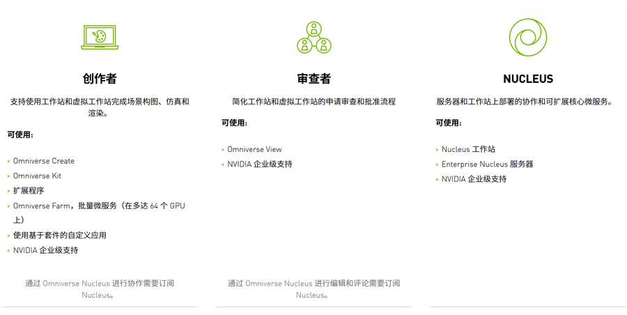 入门购买包涵盖范围:可供 2 个 Omniverse Enterprise 创作者和 10 个 Omniverse Enterprise 审查者使用,并附带 4 个 Omniverse Enterprise Nucleus 订阅。